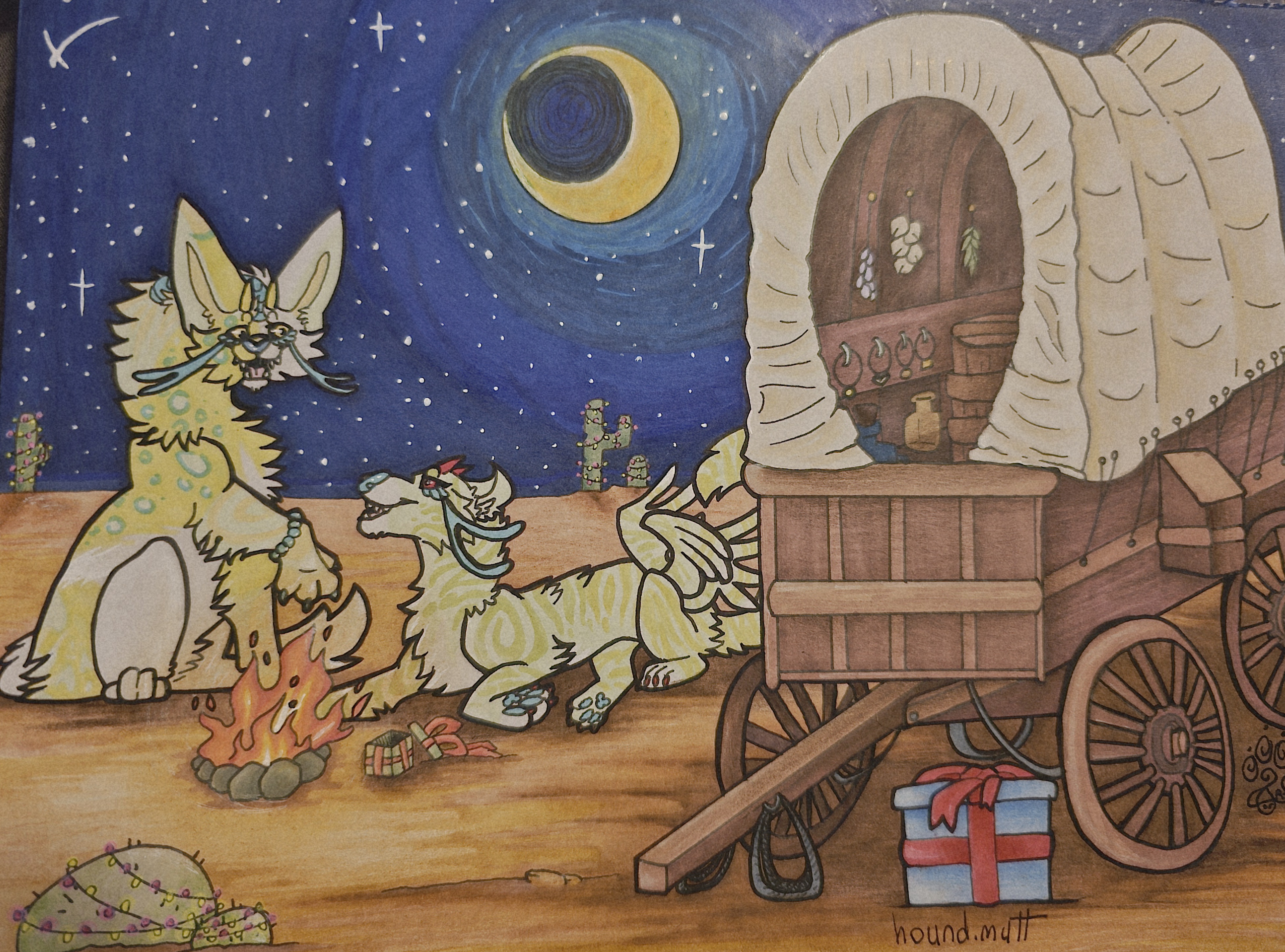 Absinthe took a step back and admired her the way she had wrapped the fairy lights around the cacti in their camp area, beaming with pride. She turned back to stoke the campfire they'd started just as her sister seemed to finish decorating the taller ones.